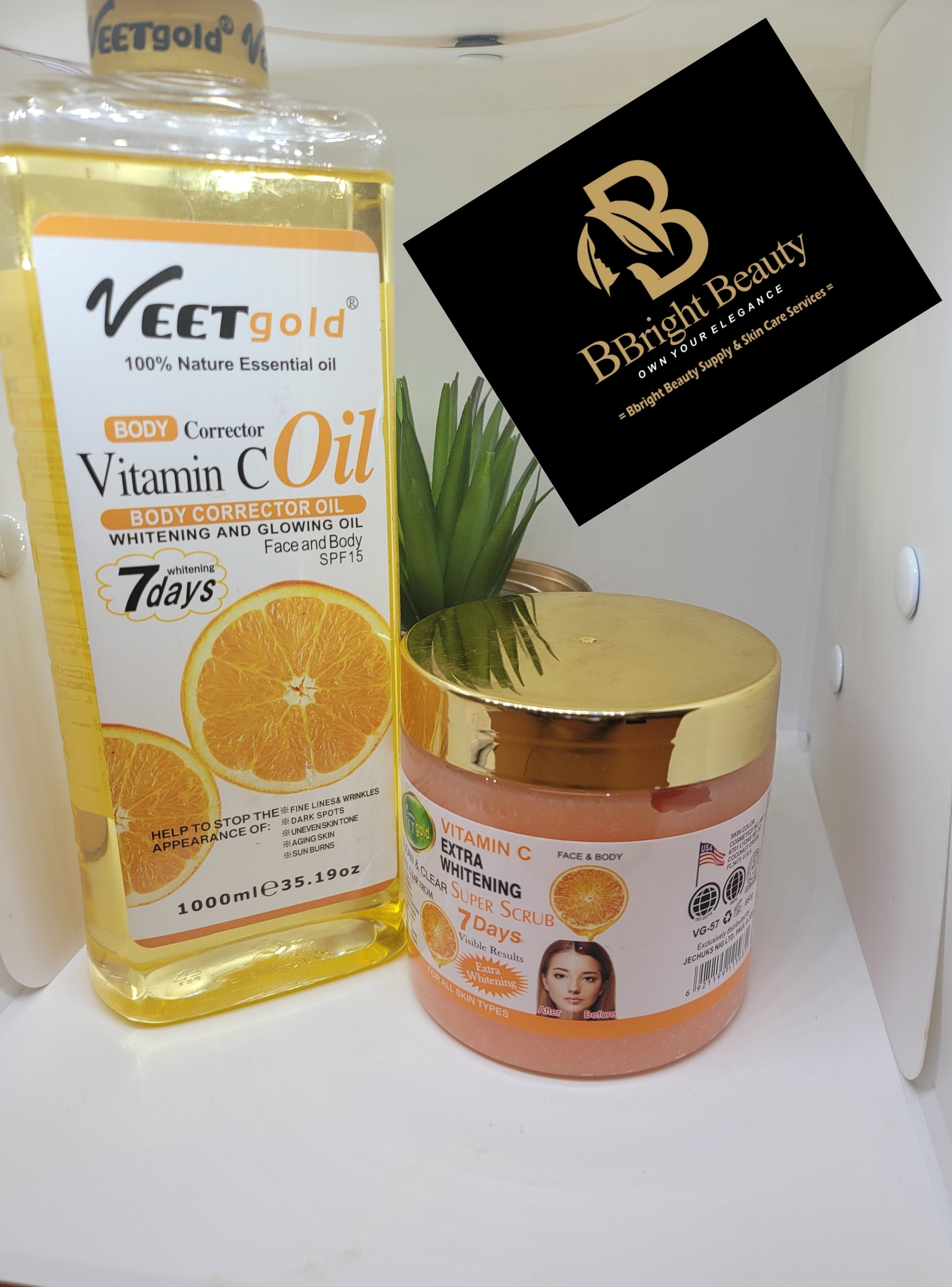 Veet Gold Vitaminc C Body Corrector Oil plus Body Scrub.It helps to improve the skin,dark spots,uneven skin tone,aging,sun burns.1000ml oil + Body Scrub 500g, that's loaded with antioxidants, it helps to exfoliate dead skin,dirts and brings out that younger looking skin
