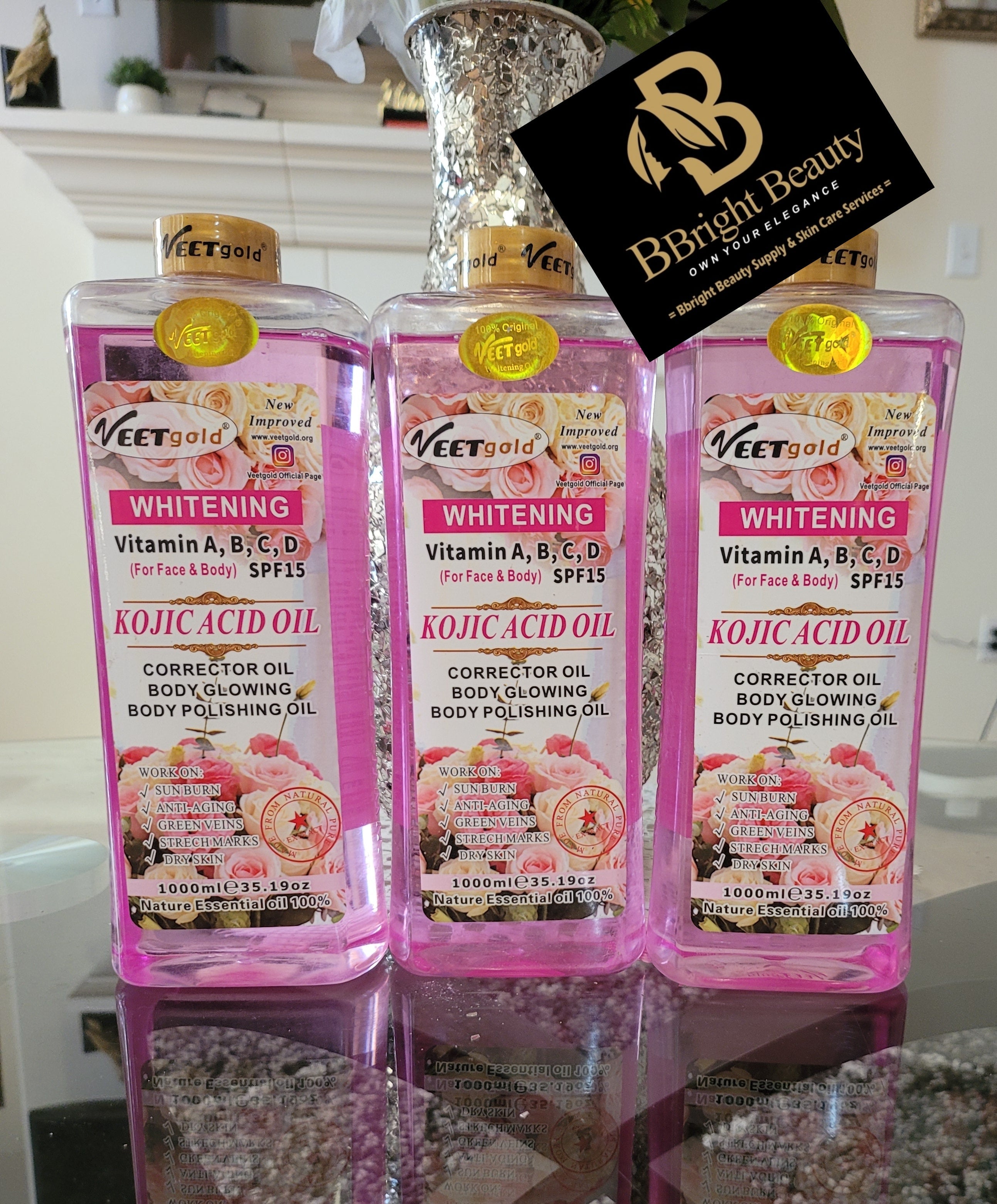 Veet gold brightening vitamin A,B,C,D for face and body with kojic Acid oil .Corrector oil,body glowing ,body polishing oil.It effectively lightens stubborn dark spots,brightening, moisturizing,smoothening,revitalizing.It works on sunburn,anti aging,green veins, stretch marks,dry skin.Nature essential oil 100%.